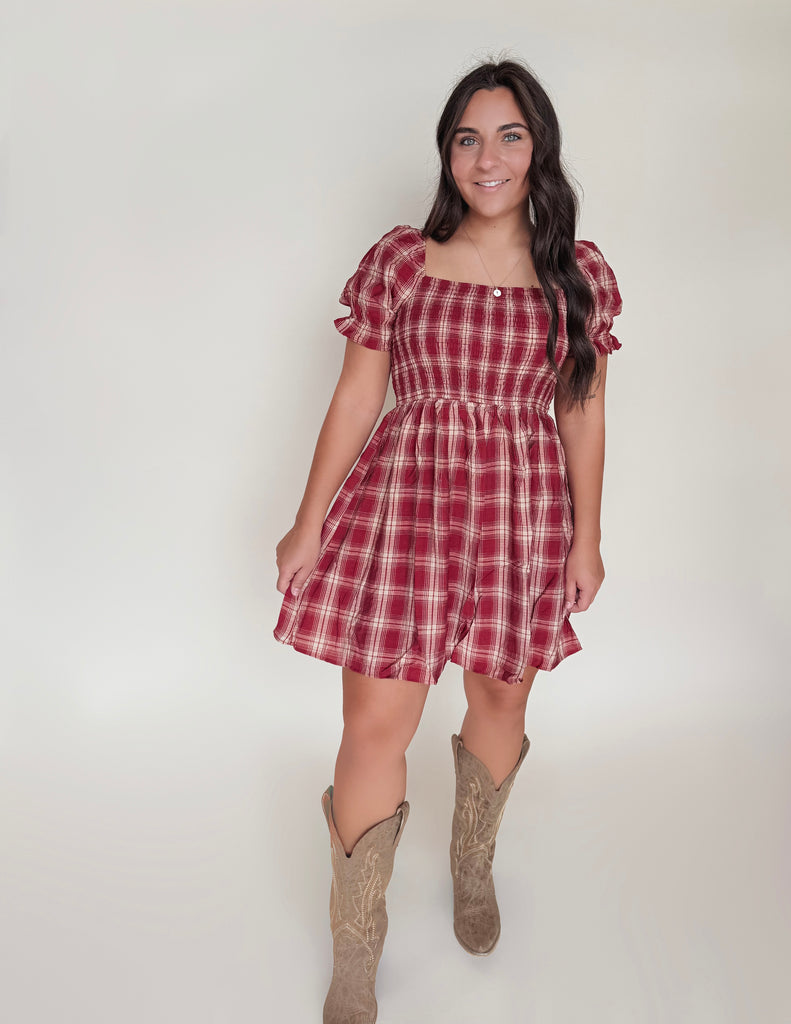 Step into fun with this playful mini dress featuring a flattering square neckline and charming short puff sleeves with elastic cuffs for a comfy fit. The smocked bodice flows into a breezy A-line skirt, all wrapped in a timeless plaid pattern that adds a pop of personality to your look. Perfect for twirling through sunny days or casual outings!