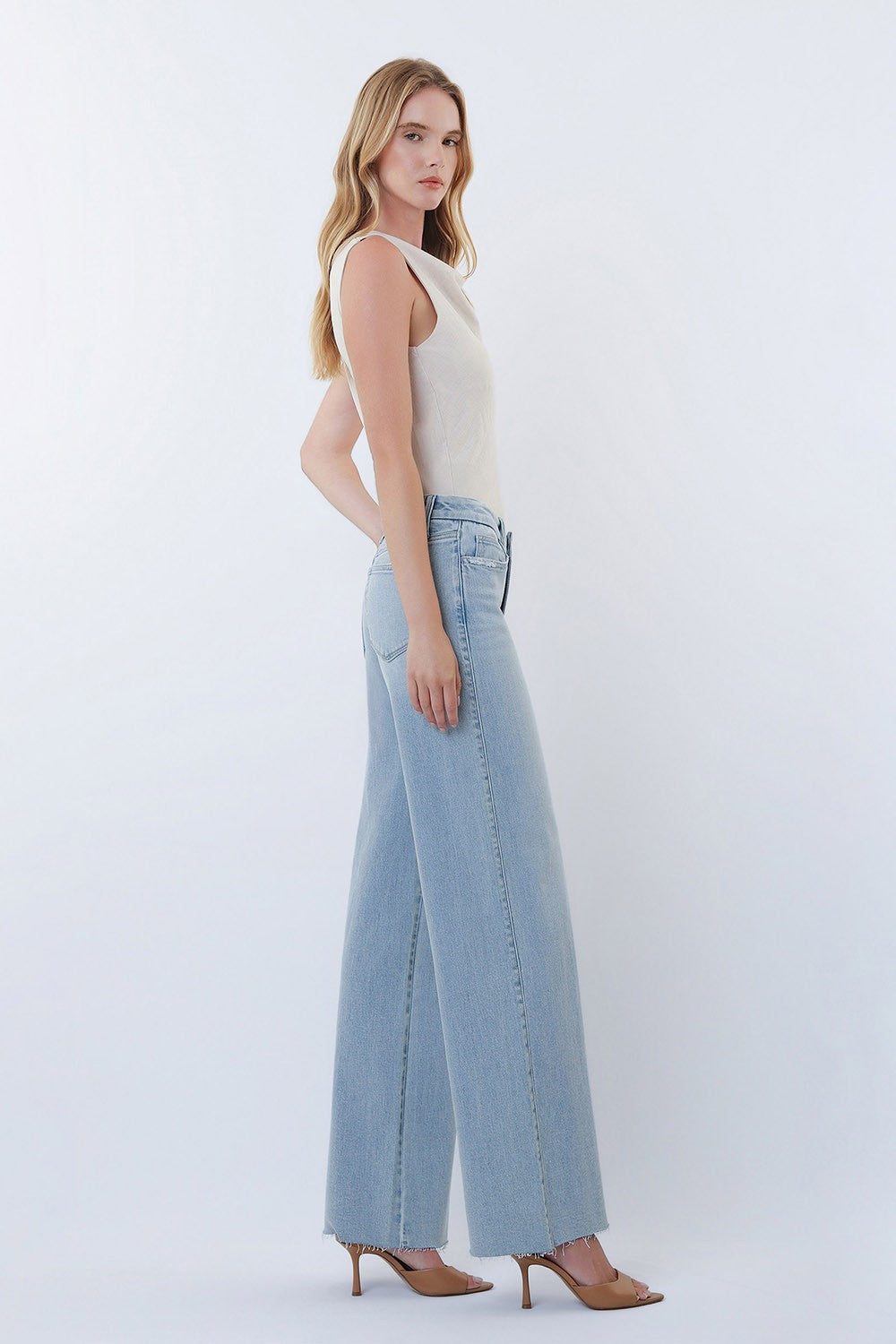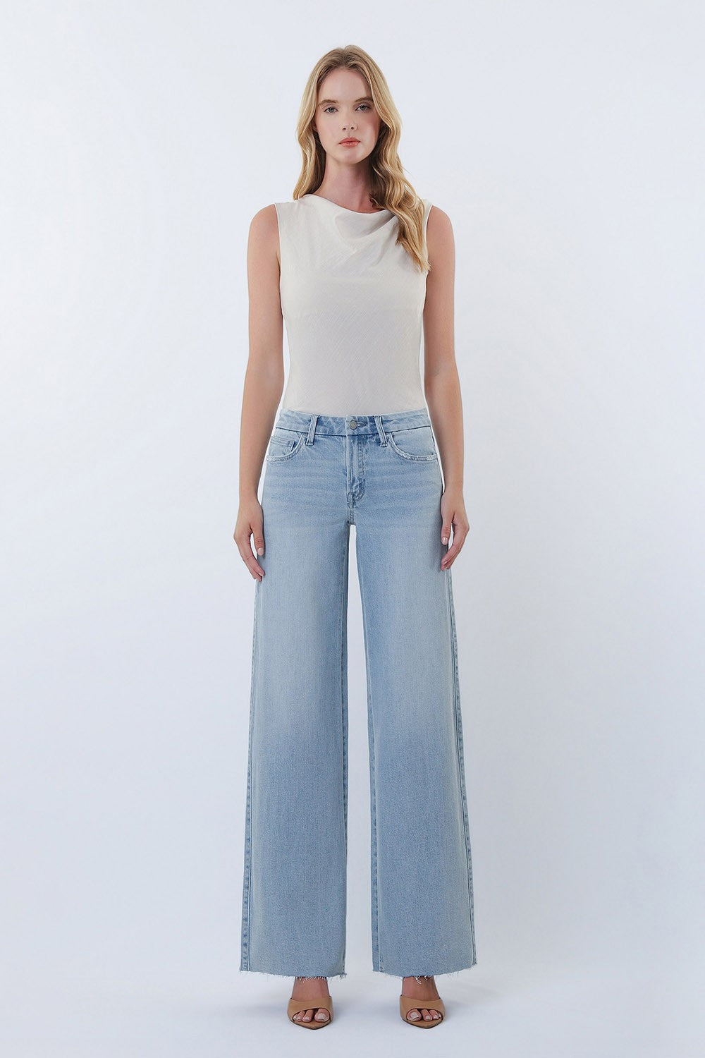 These mid-rise wide-leg jeans are your new go-to for effortless style. Crafted from comfort stretch denim, they feature a flattering mid-rise waist, classic five-pocket design, and a trendy clean-cut raw hem that adds just the right amount of edge. The light wash gives them a fresh, versatile vibe that pairs with everything in your closet. Whether you're dressing them up or keeping it casual, these full-length beauties deliver comfort without compromising on that coveted cool-girl aesthetic.