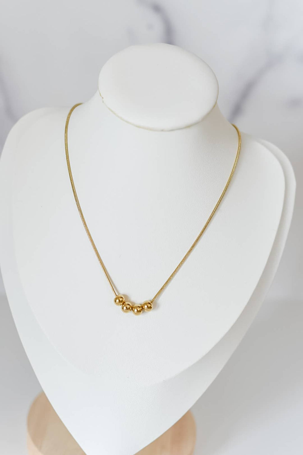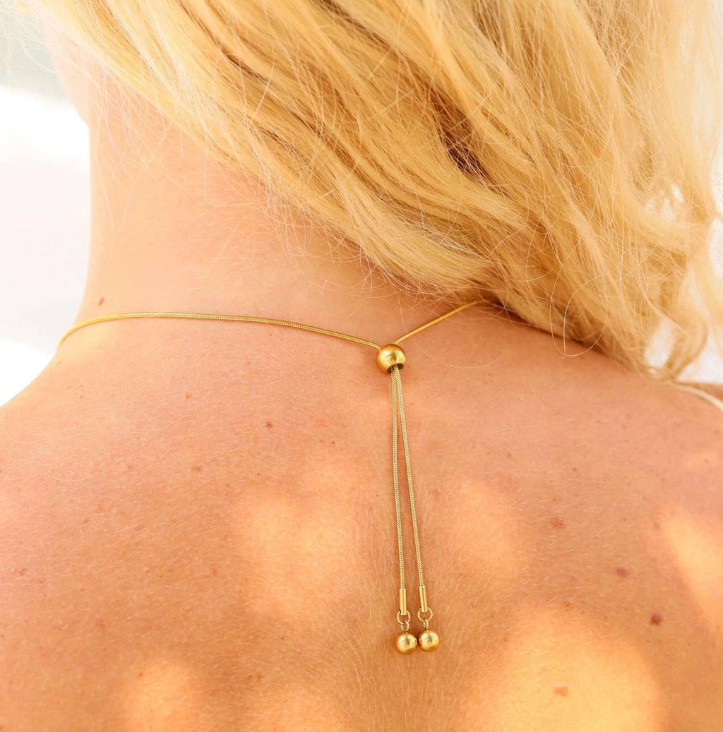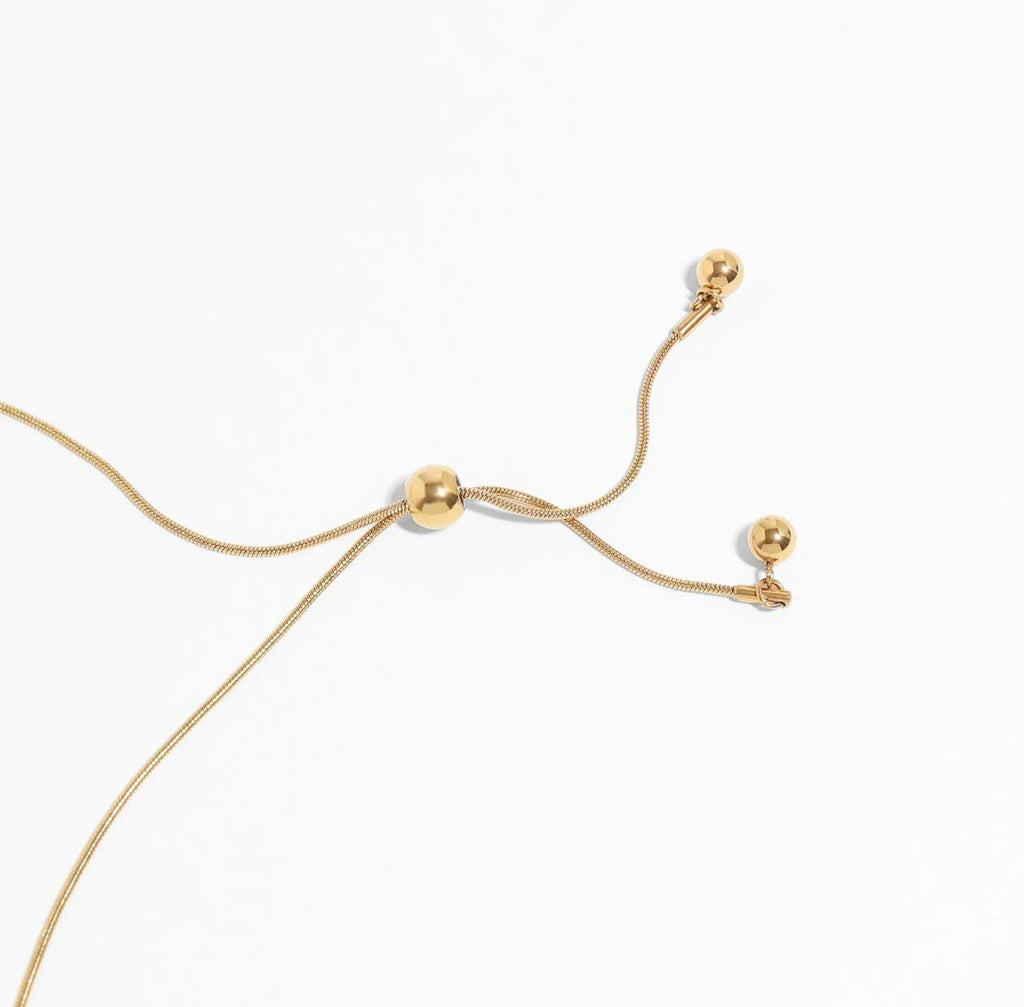 Hazel necklace *adjustable ball charm necklace *snake rope style necklace *bolo style clasp *18k gold plated stainless steel *approximately 13in adjustable *nickel & lead free. hypoallergenic *versatile: can be worn many ways comes on a white necklace card perfect for displaying in store.