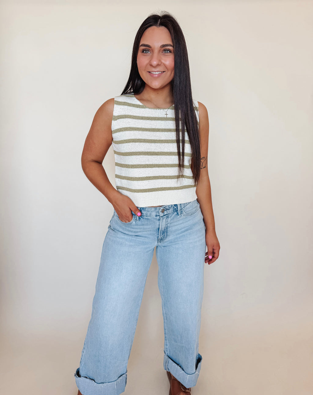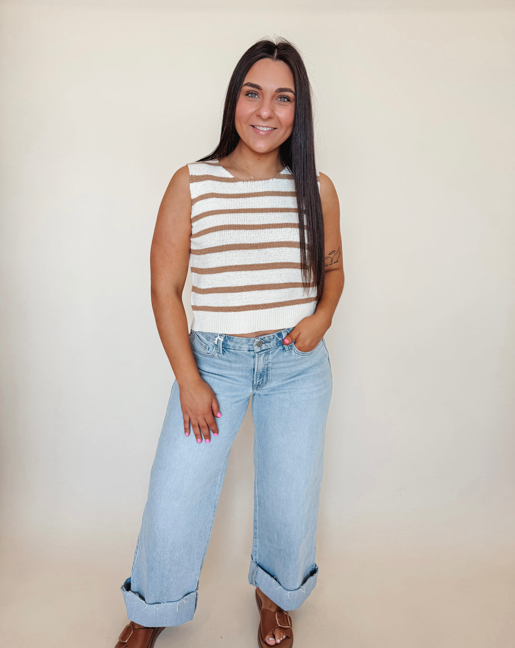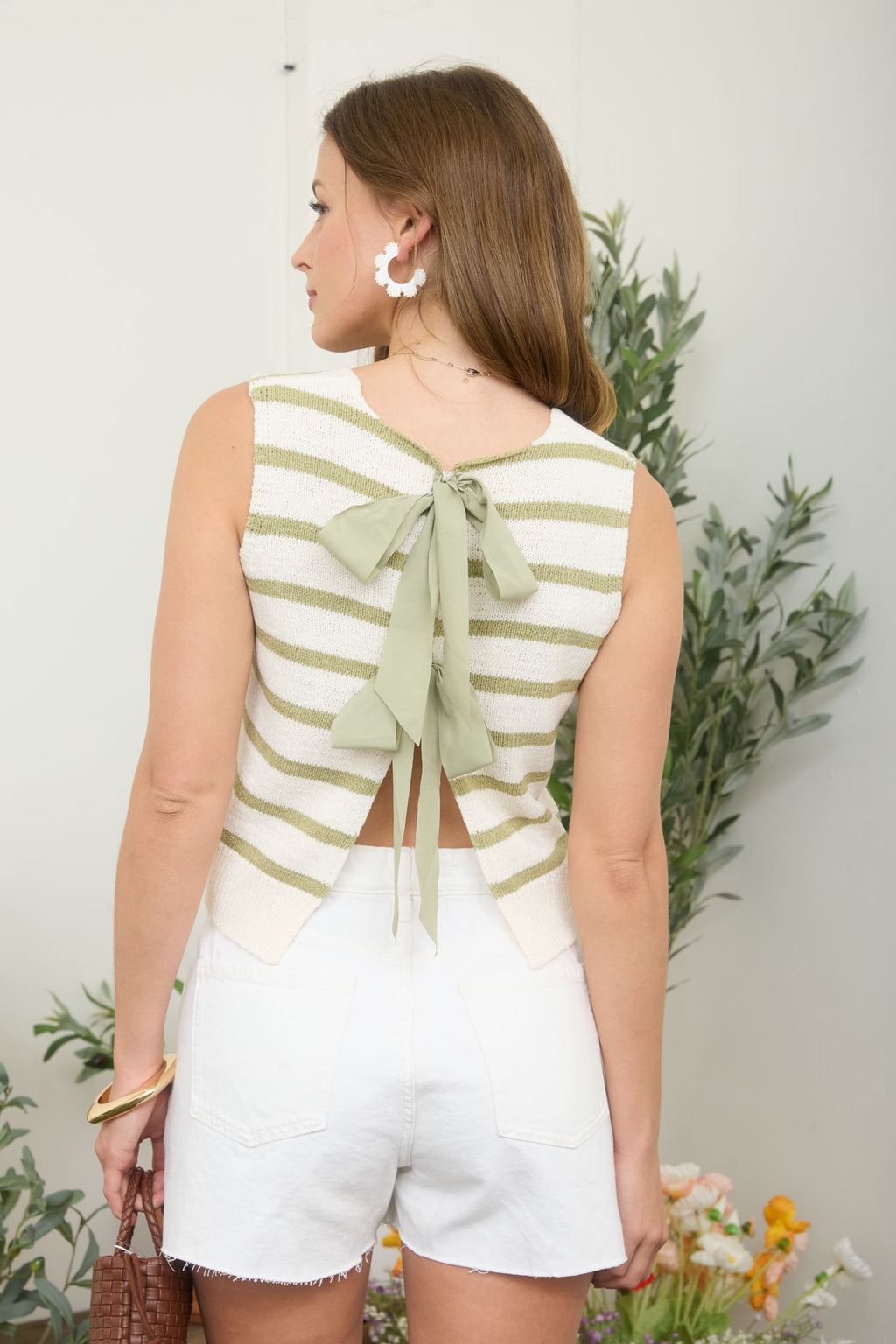 Effortless layering just got a whole lot cuter. This sleeveless knit sweater features a classic round neckline and a slightly cropped silhouette that pairs perfectly with high-waisted bottoms. The striped pattern adds visual interest, while the charming back tie detail gives you an unexpected twist—literally. Pull it on over a tee or wear it solo for instant style that feels both put-together and playfully relaxed.