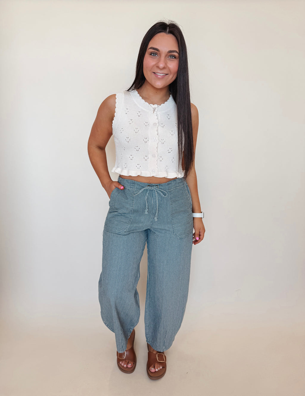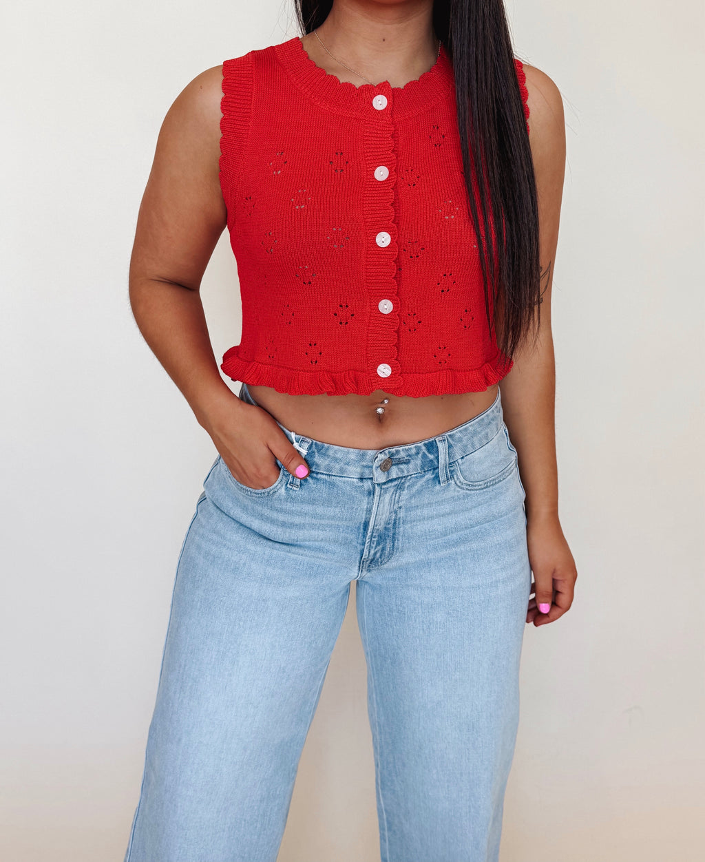 Elevate your everyday look with this charming sweater top featuring delicate ruffle detailing that adds just the right amount of flair. The sleeveless design keeps things breezy and versatile, making it perfect for layering over your favorite tees or wearing solo during milder weather. Whether you're dressing up for brunch or keeping it casual, this piece brings a touch of whimsy to any outfit. A wardrobe essential that's equal parts fun and functional.