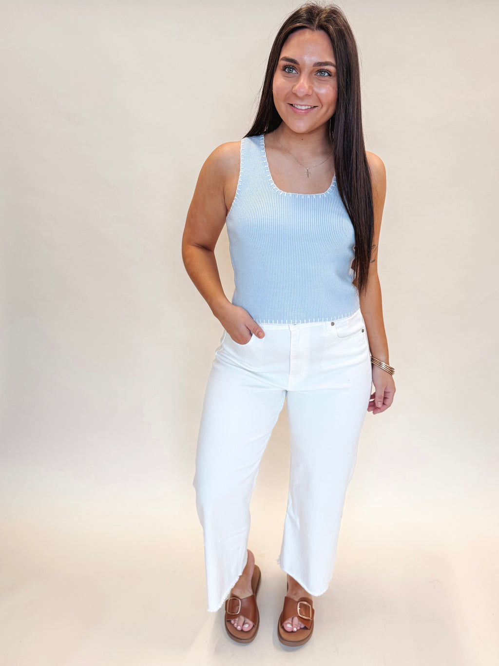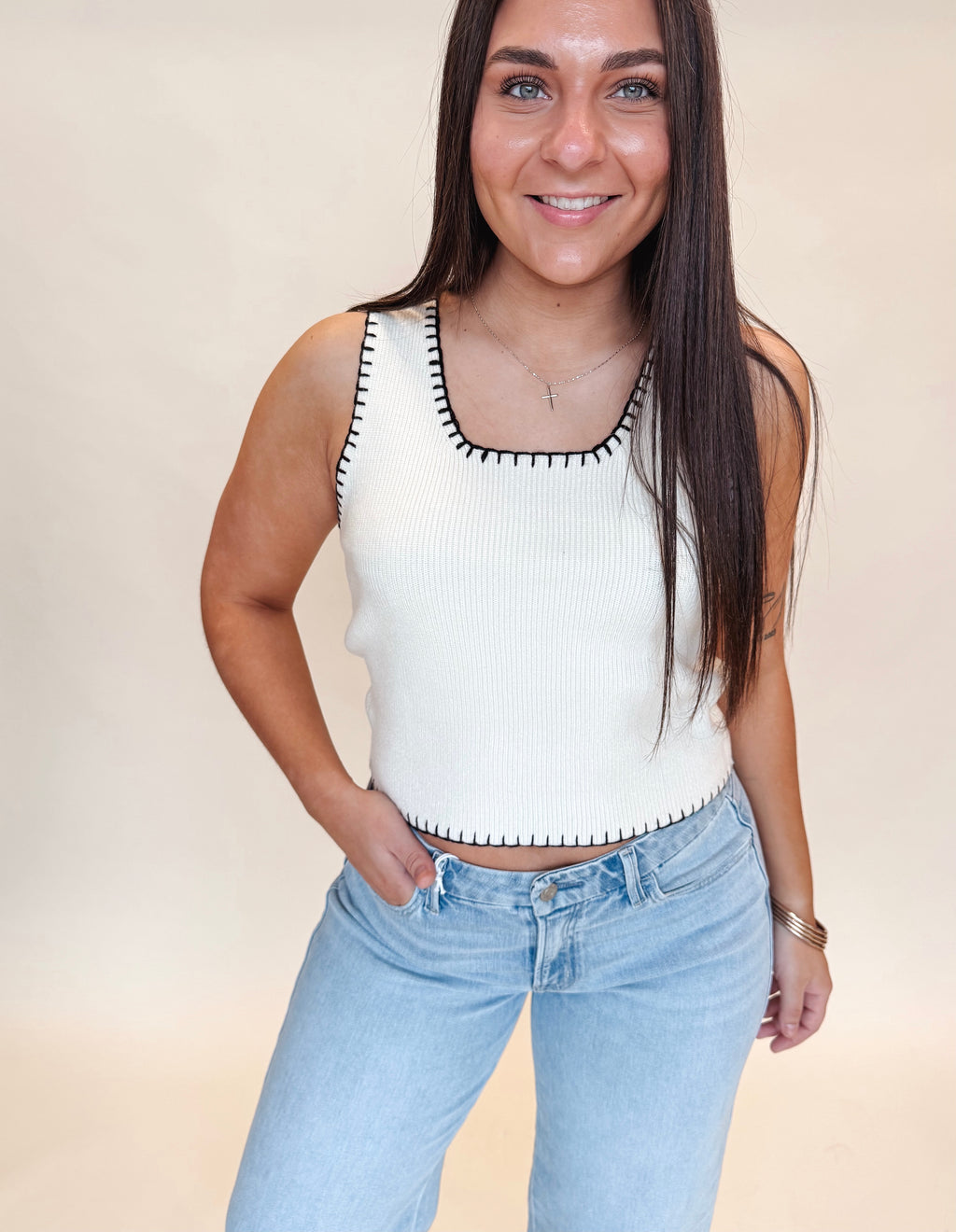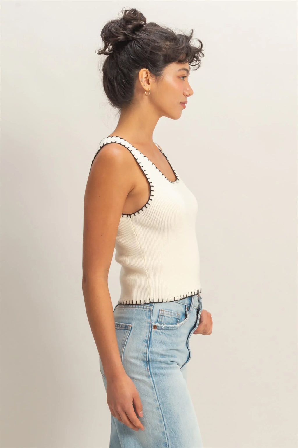 Crafted from a soft vertical ribbed knit, this tank features a square neckline and tailored sleeveless armholes, both accented by visible contrast blanket stitching for an artisanal detail. Cut in a true-to-size fitted silhouette, this tank pairs perfectly with a faded denim skirt and sandals for a chic, polished ensemble.
